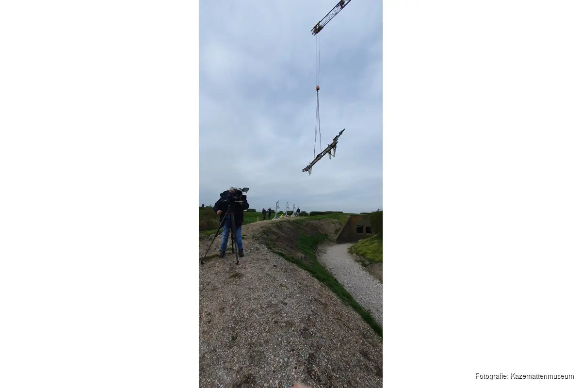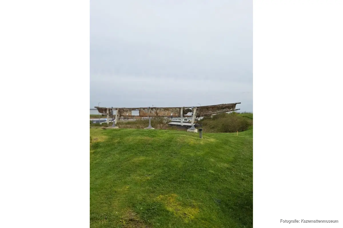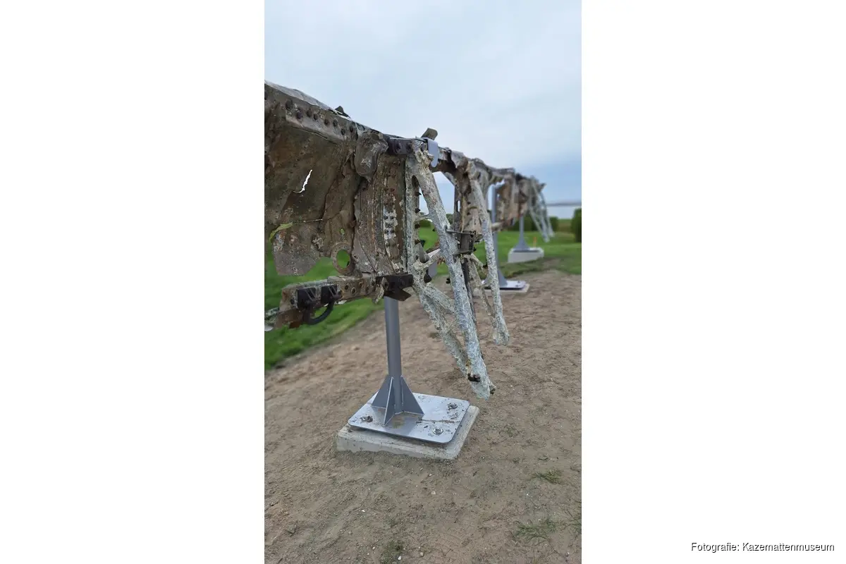 KORNWERDERZAND - Op 13 april is het restant van een vleugel van de Lancaster ED 603 bommenwerper geplaatst op een nieuwe fundering in het Kazemattenmuseum, naast de Lorentz schutsluizen. Diezelfde dag is ook één van de geborgen Rolls Royce motoren van hetzelfde vliegtuig geplaatst bij het Monumentenplein.
